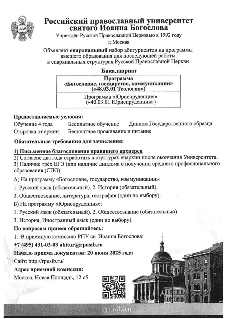 Православный университет святого Иоанна Богослова объявляет набор абитуриентов