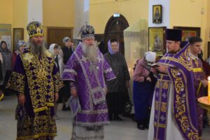Преосвященным владыкам сослужили: клирик Биробиджанской епархии иерей Кирилл Зорин, клирики Свято-Никольского храма.